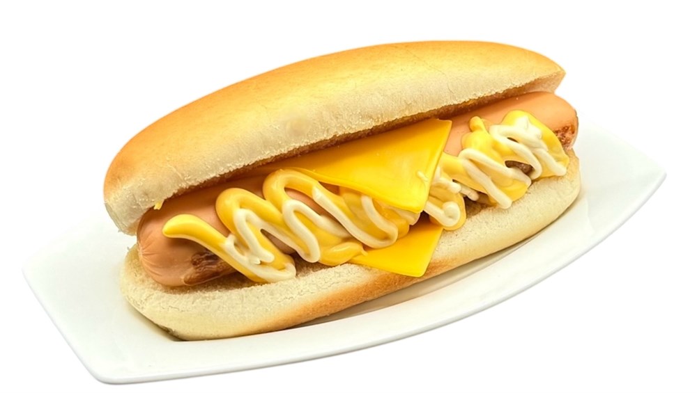 : пшеничная булочка, сосиска датская, сыр чеддр, сырный соус, майонез.