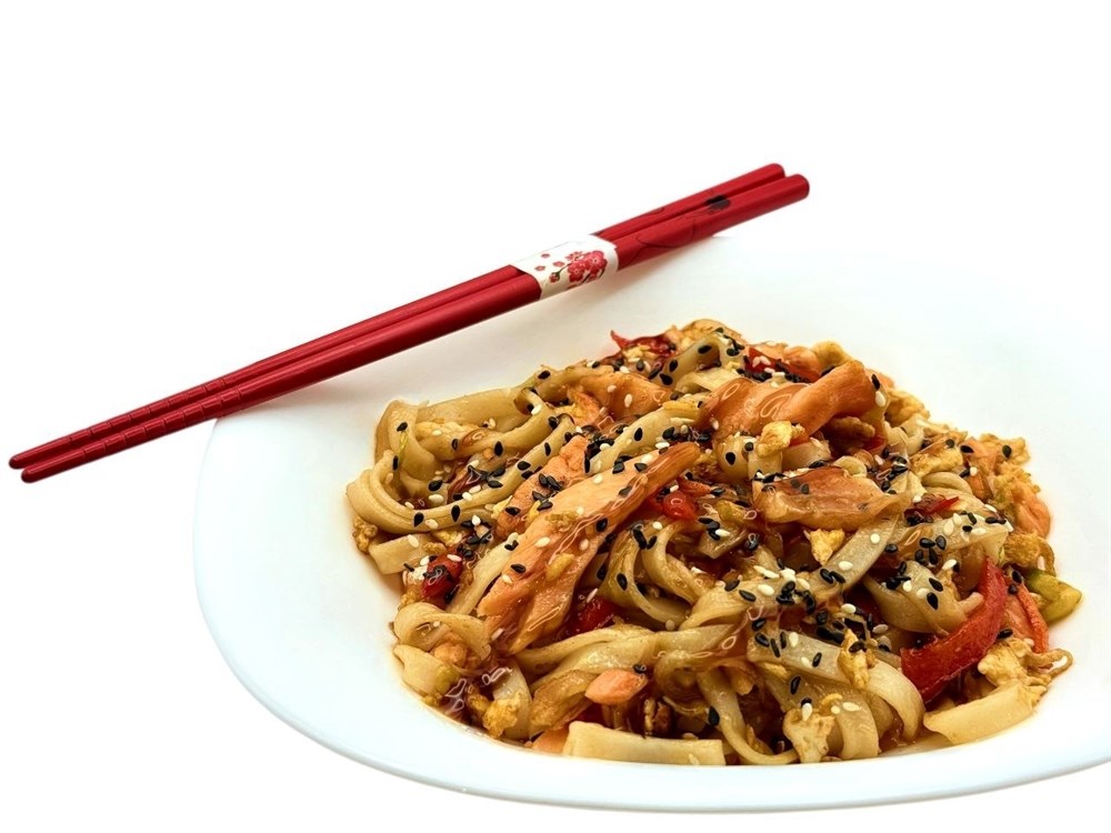 пшеничная лапша удон, лосось, перец болгарский, кабачок, морковь, чеснок, яйцо куриное, соус соевый, соус терияки, кунжут.